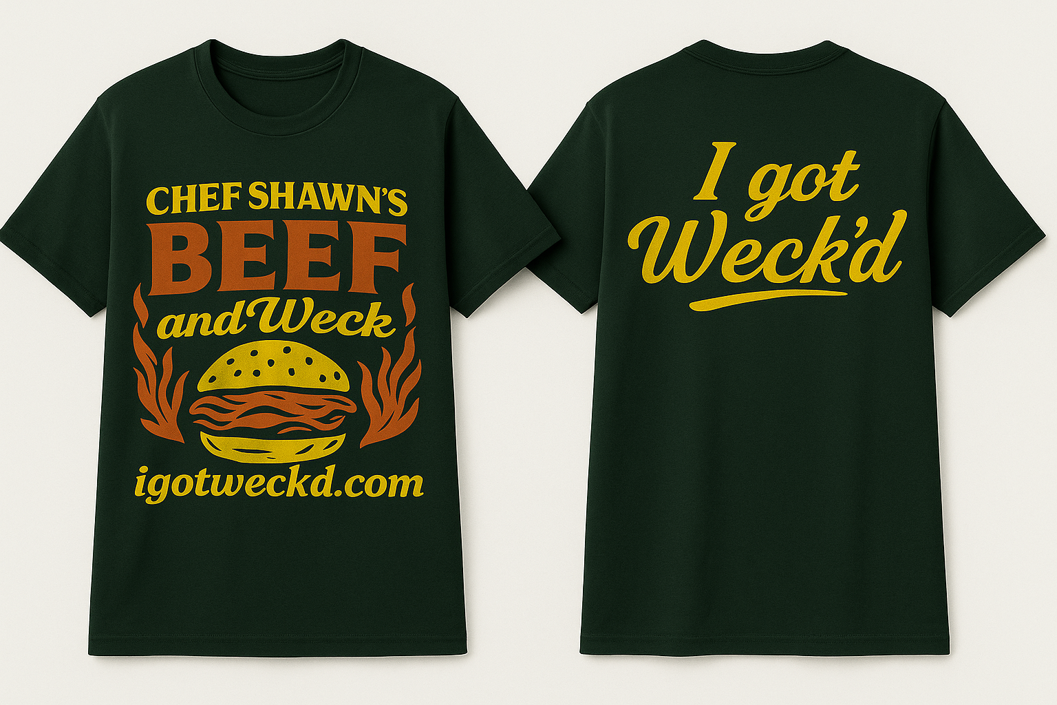 Visually, the shirts carry the full energy of the I Got Weck’d brand — forest-green base tones, metallic gold accents, and bold typography that reads with confidence from across the lot. Every element, from the embroidered sleeve tag to the back-shoulder logo placement, was designed to make a statement without being loud: local pride, real craftsmanship, and a nod to the hardworking, heat-loving spirit behind the brand.